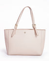 Tory Burch Perry Tote Bag is the definition of minimalist, multitasking luxury. Crafted from durable Saffiano-style leather in a delicate Pink hue, the tote features adjustable slim top handles. The design is practical with a triple-compartment structure.
