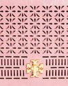 Tory Burch Laser-Cut Shoulder Bag is rendered in a premium coral-pink leather. The design is defined by its elaborate laser-cut pattern, featuring a repetitive floral and geometric motif across the front flap that provides a light, airy texture. A standout feature is the signature gold-tone Double T logo centered on the lower decorative band, which serves as a prestigious mark of the brand's designer heritage. Finished with a polished gold-tone chain-link strap.
