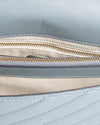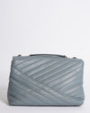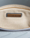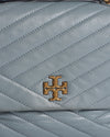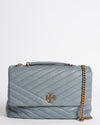 Tory Burch Kira Chevron Large Convertible Shoulder Bag is rendered in a premium, soft quilted leather in a muted slate blue hue, featuring a graphic linear chevron pattern that adds a dimensional, architectural quality to the silhouette. A standout feature is the convertible chain strap, crafted from burnished gold-tone metal and finished with tonal leather shoulder guards for maximum comfort. The strap can be worn long for crossbody convenience or doubled to create a shorter shoulder bag look. Finished with the iconic Double T logo in beveled gold-tone hardware on the front flap.