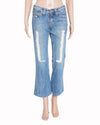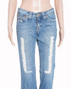 True Religion Denim is meticulously crafted from premium light blue cotton denim, featuring a heavily washed finish for a soft, authentic lived-in feel. The design is defined by its flared-leg silhouette, providing a fitted look through the thigh that expands into a wide hem, perfect for pairing with statement footwear. A standout feature is the shredded vertical distressing on the front of both legs, which reveals textured, ribbed fabric underlays for a rugged, multi-dimensional appeal.