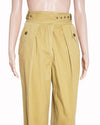 Ulla Johnson Yellow Pants are a striking example of the designer’s ability to combine utilitarian structure with feminine, bohemian-inspired details. These high-waisted trousers are rendered in a warm mustard yellow, crafted from a durable, high-quality cotton twill that offers both structure and comfort. The design is defined by its unique architectural silhouette, featuring a tapered leg that is accentuated by intricate pleating and darting at the hemline.
