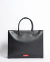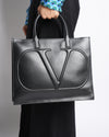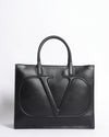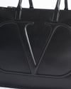 Carry your essentials in sophisticated style with Valentino Black Leather V Logo Large Tote Bag. Crafted from luxurious black leather, this spacious tote is an epitome of refined elegance and modern design. It features a striking, debossed VLogo on the front, making a bold yet understated statement. The sturdy top handles offer comfortable carrying, while the generous interior provides ample space for all your belongings, making it ideal for daily use, work, or travel.