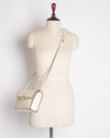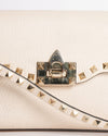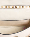 The Valentino Cream Leather Rockstud Crossbody Bag. Crafted from luxurious cream-colored leather, this structured crossbody features a classic flap silhouette adorned with the iconic gold-tone Rockstud embellishments along its edges and strap. The sophisticated cream hue provides a soft contrast to the signature hardware, creating a statement piece that's both refined and rebellious. Perfect for adding a touch of high-fashion flair to any outfit, this Valentino Garavani bag offers both style and practicality for day-to-night wear.