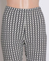 Valentino Garavani Black & White Shorts, showcasing a bold, graphic design. The shorts are held up, revealing a repeating chevron pattern in stark black and white, creating a visually striking contrast. The knit fabric appears to have a ribbed texture, adding depth to the geometric design. The silhouette is a mid-thigh length, suggesting a sporty or casual style. The blurred background hints at a domestic setting, emphasizing the shorts as a standalone piece. The iconic Valentino Garavani aesthetic, known for its bold prints and luxurious simplicity, is clearly represented in this garment, making it a statement piece that balances comfort and high fashion.