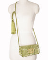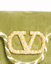Valentino Garavani Locò Crossbody Bag is rendered in a luxurious sage green velvet. The design is defined by its sleek rectangular flap silhouette, meticulously framed by a two-tone twisted rope trim in green and cream. A standout feature is the oversized VLogo Signature hardware on the front, which is intricately pavé-set with shimmering crystals for a touch of red-carpet glamour. Finished with a dramatic long-rope crossbody strap ending in voluminous tassels.