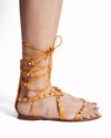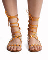Valentino Garavani Rockstud Gladiator Sandals are expertly crafted from premium mustard yellow leather, offering a vibrant and modern take on a classic silhouette. The design features an intricate cage-like construction of slender straps that wrap elegantly around the foot and ankle. Each strap is meticulously adorned with the house's signature gold-tone pyramid Rockstuds, providing a tough-luxe edge. Designed for style and ease, these flat sandals feature a comfortable lace-up closure with long leather ties and a smooth tan footbed.