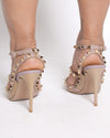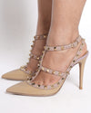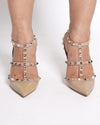 Valentino Heels, featuring a sophisticated blend of beige patent leather and dusty rose straps. These highly sought-after pumps are adorned with Valentino's signature platinum-finish pyramid Rockstuds, meticulously placed along the multi-strap design, creating an unmistakable and edgy allure. The sleek pointed toe and elegant stiletto heel ensure a flattering silhouette.