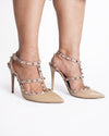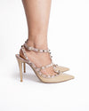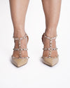 Valentino Rockstud Pointy Toe Heels. These coveted heels are crafted from polished patent leather in a versatile beige hue. They feature a sleek, modern pointy toe and are beautifully adorned with the brand's signature pyramid studs in a polished gold-tone, creating a rebellious yet elegant look. The strap detailing offers a secure fit.