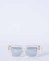 Valentino Eyewear Collection highlights authenticity and couture legacy with Japanese craftsmanship. This design features a translucent ivory squared acetate frame, an iconic V-logo hinge, and a studded yellow gold V-logo on the temple. With an RFID chip and medium grey-silver flash mirror lenses