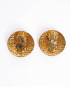 Vintage Chanel Gold Plated Clip-On Earrings, crafted in France. These round earrings feature a highly detailed textured gold-tone surface with the iconic, intricately stylized interlocking CC logo at the center.
