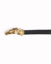 Vintage Gucci Double Horse Head Belt is rendered in a premium smooth black leather. A standout feature is the extraordinary sculptural buckle in a polished gold-tone finish, depicting two dynamic horse heads with flowing manes arranged in a symmetrical, high-relief composition.
