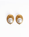 Vintage Lanvin clip-on earrings that are gold plated and feature pearl accents. The gold-toned setting has a ribbed, oval design surrounding a large, central faux pearl cabochon in an oval shape. The earrings are marked as "Made in Germany" and have a luxurious, classic aesthetic.