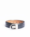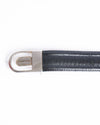Valentino belt is a timeless and elegant accessory. It is a classic black leather belt with a refined, minimalist design. The standout feature is the polished silver-tone buckle, which has a unique, sleek shape and is engraved with the "VALENTINO" logo. The supple leather is well-preserved, showcasing the quality of the material and craftsmanship.