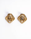 Vintage YSL Gold Plated Clip-On Earrings, crafted in France. These elegant pieces feature a geometric cushion shape surrounding a prominent hammered domed center. The multi-dimensional design uses highly polished gold plating to create a sophisticated, sculptural look.