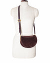 Wandler Kate Bag is rendered in a premium suede in a rich deep burgundy hue. The design is defined by its signature half-moon silhouette, featuring a curved top and a structured, rounded base. A standout feature is the wide, adjustable leather shoulder strap in a matching tonal burgundy, which is anchored by a polished gold-tone circular buckle for a touch of industrial elegance. The front is finished with a discreet gold-foil "Wandler" logo centered at the base.