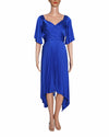 Zwaan Pleated Blue Dress is rendered in a premium, high-luster cobalt blue satin. The design is defined by its architectural V-neckline and off-the-shoulder draped sleeves, creating a sophisticated and romantic silhouette. A standout feature is the meticulous sunray pleating that starts from the waist and flows into a dramatic, multi-layered handkerchief hemline. Finished with a structured bodice and fluid, asymmetrical panels.